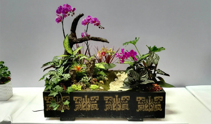 4.整體平衡,層次分明,體例適宜。組合盆栽的結構和造型要求平衡與穩重,上下平衡,高低錯落,層次感強。器皿的高矮、大小與所配置的花卉綠植相協調。